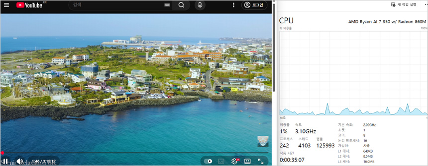유튜브 고화질 동영상을 이용해 CPU 점유율을 테스트 하고 있는 모습으로 (2160P@60FPS) 1-12% 대의 점유율을 보여 주었으며 인터넷을 실행했을 때 10% 후반까지 점유율이 올라가는 것을 확인할 수 있었다.