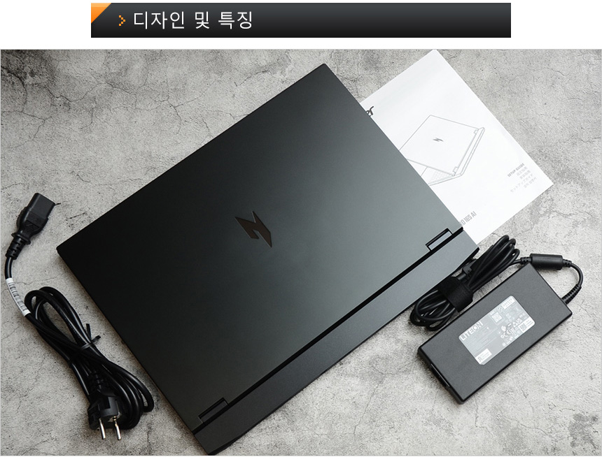 풀KIT 의 모습으로 노트북을 비롯해 230W 전원 어댑터와 전원 케이블이 제공되며 퀵 매뉴얼이 포함된 것을 확인할 수 있다.