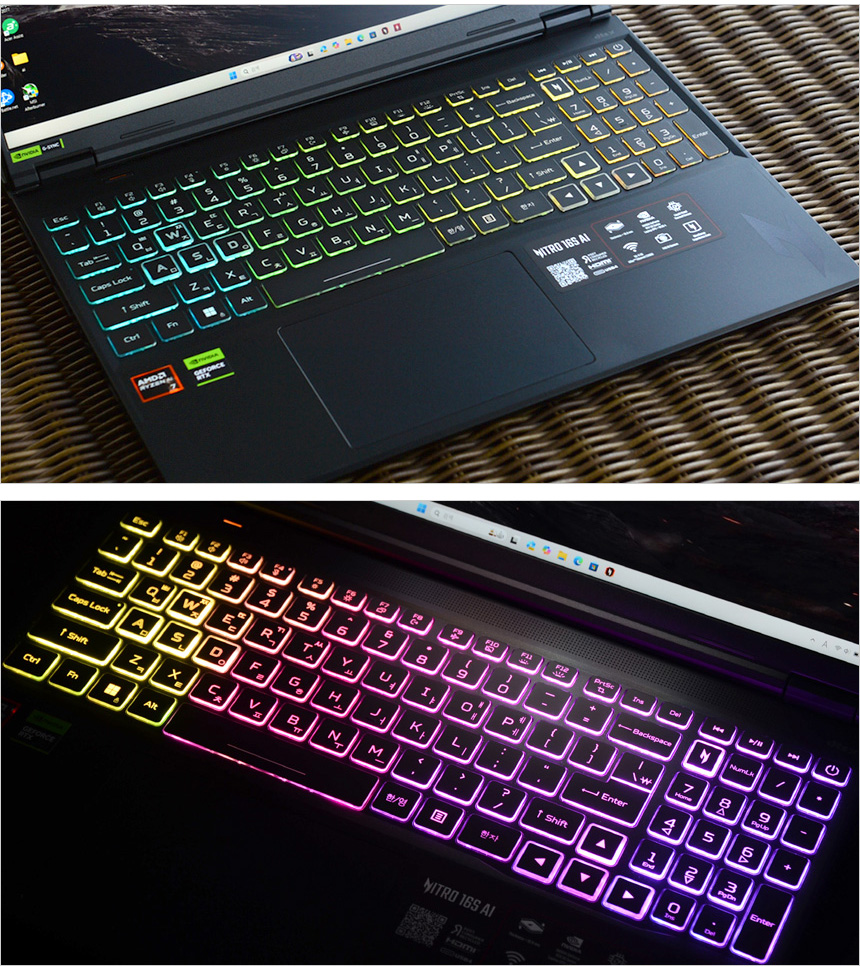 키보드 상단에는 통풍구가 설치되어 있고 퍼포먼스를 손쉽게 조정할 수 있도록 모드 버튼이 설치된 것을 확인할 수 있다. (모드마다 컬러가 달라져 쉽게 인지할 수 있다.) 또한 1열에는 볼륨, 밝기, 에어플레인 모드, 터치패드 비활성화 등 다양한 핫키를 제공해 편의성을 높였으며 우측에는 전원 버튼과 니트로 센스 S/W를 실행할 수 있는 전용키를 제공해 편하게 노트북을 조정할 수 있다. 또한 팜래스트 중앙에는 멀티터치 패드가 장착되어 마우스 없이도 편하게 노트북을 조작할 수 있다.