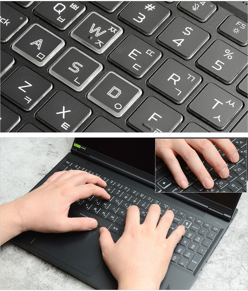 키보드의 모습으로 대화면 노트북 답게 텐키가 포함된 풀사이즈 키보드를 제공해 숫자 입력이 많은 엑셀등의 작업도 편하게 실행할 수 있다. 또한 단색의 LED 백라이트를 지원하는 일반 노트북과 달리 4존 RGB LED 백라이트를 지원해 화려한 조명 효과를 즐길 수 있다. (폰트 뿐만 아니라 키캡 테두리 까지 발광되어 구분감을 한층 높였다.)