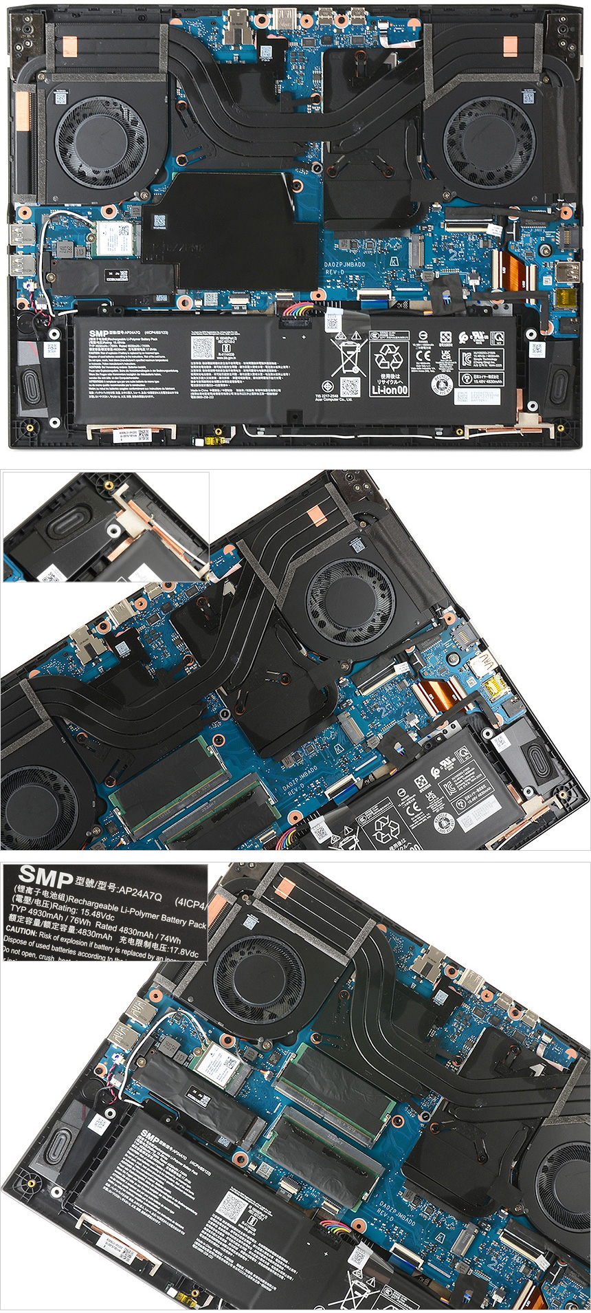 노트북 내부의 모습으로 듀얼 쿨링 시스템이 적용되어 있으며 전원부와 칩셋을 모두 덮는 히트싱크와 히트파이프가 부착된 것을 확인할 수 있다. 또한 하단에는 4930mAh 용량의 리튬이온 배터리가 설치되어 있으며 무선랜 안테나와 스피커가 장착된 것도 확인할 수 있다.