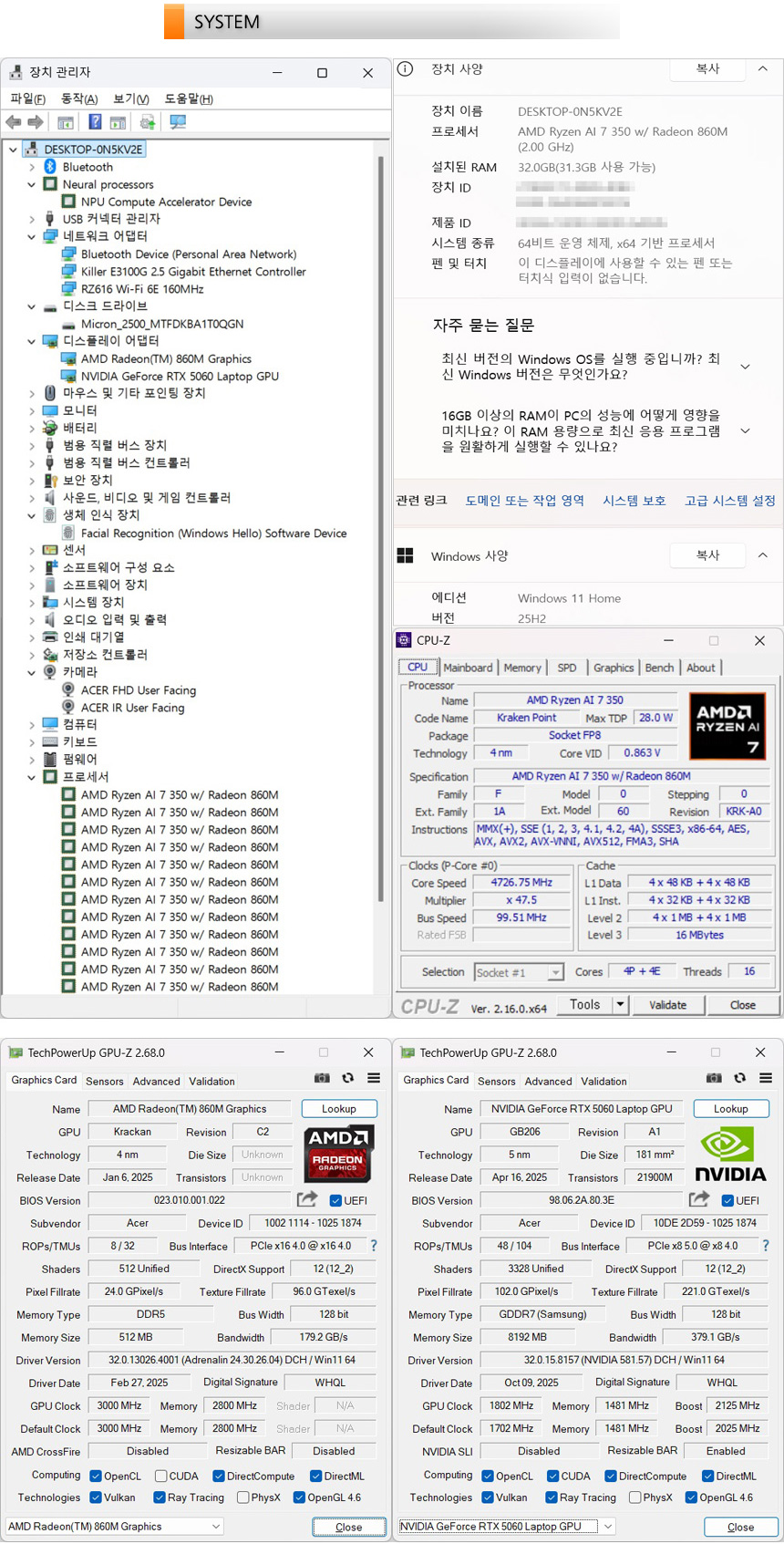 시스템 정보를 확인하고 있는 모습으로 8코어/16스레드에 8+16MB 캐시를 지원하는 AMD의 최신 모바일 프로세서 라이젠 AI 7 350이 장착된 것을 확인할 수 있으며 RTX 5060 랩탑 GPU가 장착되어 대부분의 게임을 상위 옵션에서 플레이 할 수 있다. 또한 Wi-Fi 6E 무선랜카드가 장착되어 있고 32GB 듀얼채널 DDR5 메모리와 1TB PCIe 4.0 NVMe SSD가 장착되어 대부분의 작업을 빠르게 실행할 수 있다.
