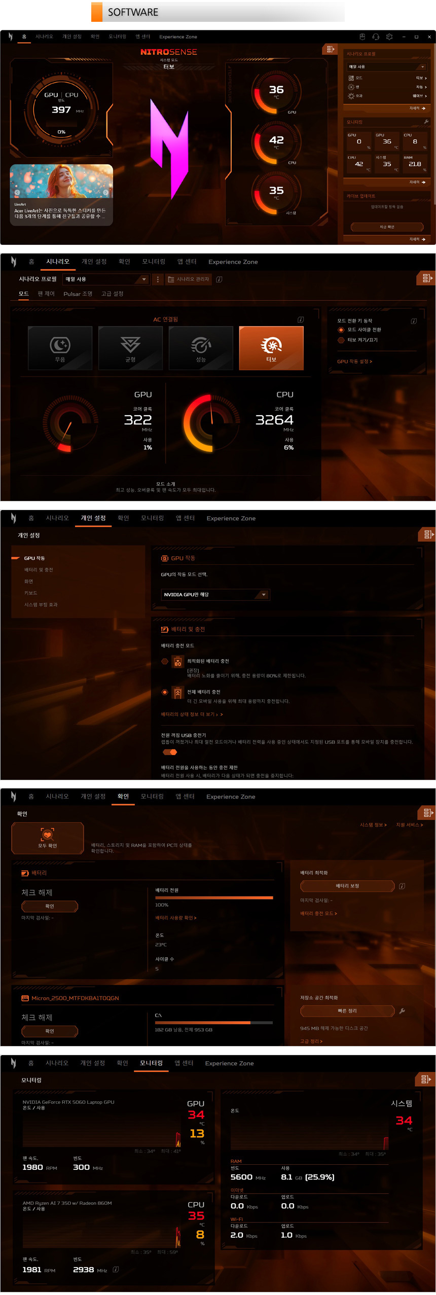 전용 S/W인 니트로 센스를 실행한 모습으로 퍼포먼스 설정이 가능하며 팬속도와 GPU 설정도 가능하다. 또한 시스템 모니터링을 지원해 노트북 작동상황을 한눈에 확인할 수 있다. (다양한 설정을 지원한다. 구입후 용도에 맞게 노트북을 셋팅하기 바란다.)