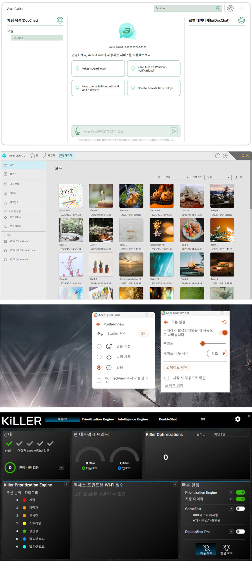 노트북 사용중 궁금한 점을 빠르게 알려주는 에이서 어시스트를 지원하며 (현재 영문만 지원한다.) 직관적인 인터페이스를 지원하며 AI 기술을 통해 이미지의 배경을 쉽게 제거할 수 있어 디자인 등의 작업용으로도 유용하게 활용할 수 있는 Acer LiveArt를 제공한다. 또한 화상회의시 편하게 카메라와 마이크를 셋팅할 수 있도록 퀙 패널이 제공되며 킬러랜 설정을 위한 전용앱도 지원한다.