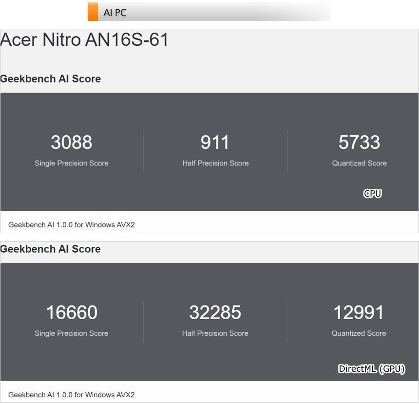AI 전용 벤치마크 툴을 이용해 AI 성능 테스트를 진행하고 있는 모습으로 AI에 특화된 프로세서와 고성능 GPU가 탑재된 모델답게 일반 노트북과 비교되는 높은 스코어를 보여주었다.