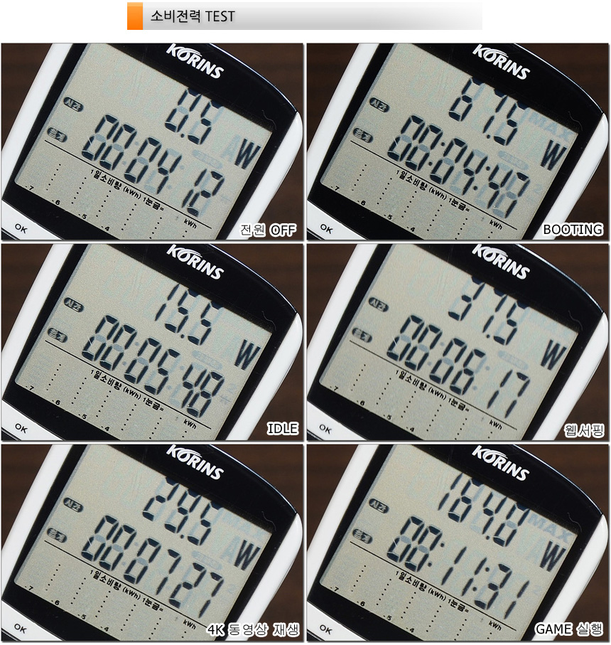 소비전력 테스트를 진행하고 있는 모습으로 (최고성능 모드) 가벼운 작업에서는 50W 내외로 작동했으며 CPU와 GPU가 최고 속도로 동작하는 게임에서는 160W 까지 소비전력이 올라가는 것을 확인할 수 있었다.