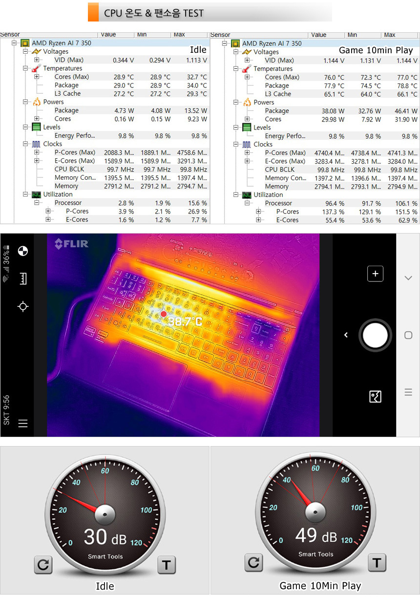 CPU 온도 테스트를 진행하고 있는 모습으로 (최고성능 모드, 실내온도 21도) 아무것도 하지 않는 Idle 상태에서는 20도 후반대로 작동했으며 게임을 10분 정도 실행후 온도를 측정했을 때 70도 후반까지 온도가 올라가는 것을 확인할 수 있었다. (가끔씩 90도 이상으로 온도가 튀기는 했지만 대부분 60도 중반~70도 중반 에서 게임이 플레이 되었다.) 또한 열화상 카메라를 이용해 게임 실행시 열분포를 확인해 보았는데 열이 골고루 퍼지며 고성능 게이밍 노트북임에도 표면 온도가 낮은 것이 눈에 띈다. 특히 팔을 올려두는 팜래스트 부분은 상대적으로 온도가 낮아 게임이나 타이핑시 열로 인한 불쾌감을 느끼지 않을 것이다.