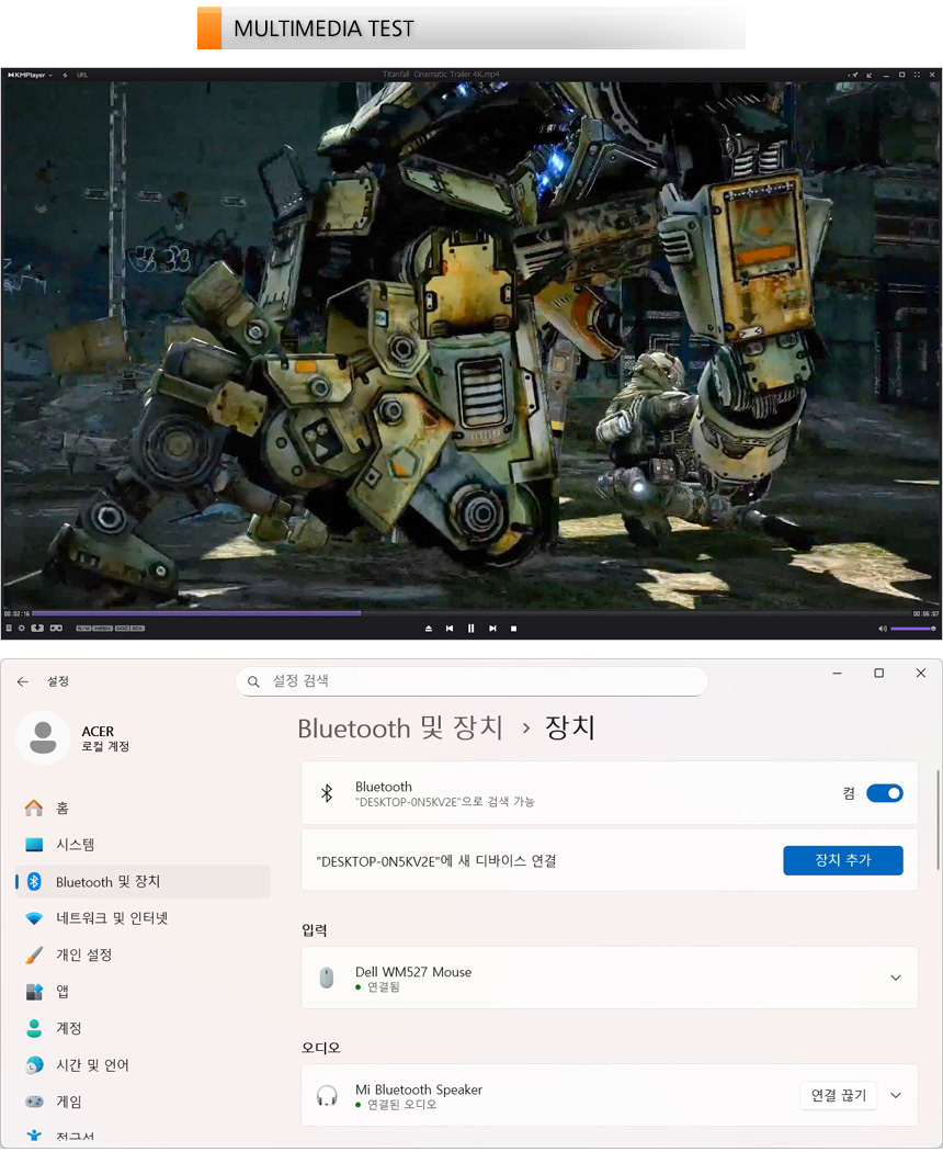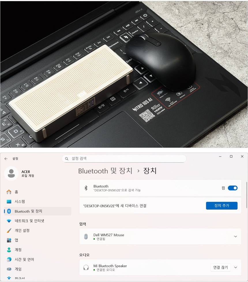 블루투스를 지원해 다양한 액세서리를 무선으로 연결할 수 있다. 상단의 사진은 스피커와 마우스의 연결 모습으로 원활하게 페어링 되는 것을 확인할 수 있었으며 완벽하게 작동했다.