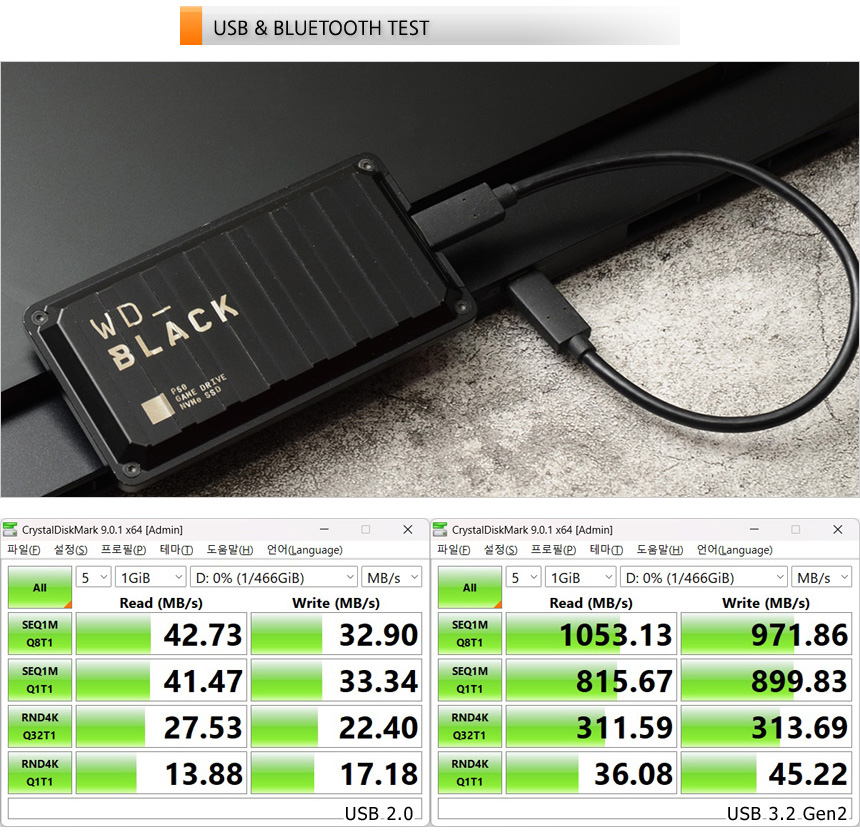 USB 3.2 Gen2 단자를 지원해 빠른 데이터 전송이 가능하다. 상단의 사진은 외장 SSD를 이용해 테스트를 진행하고 있는 모습으로 USB 2.0과 확연한 속도 차이를 보여주었다.