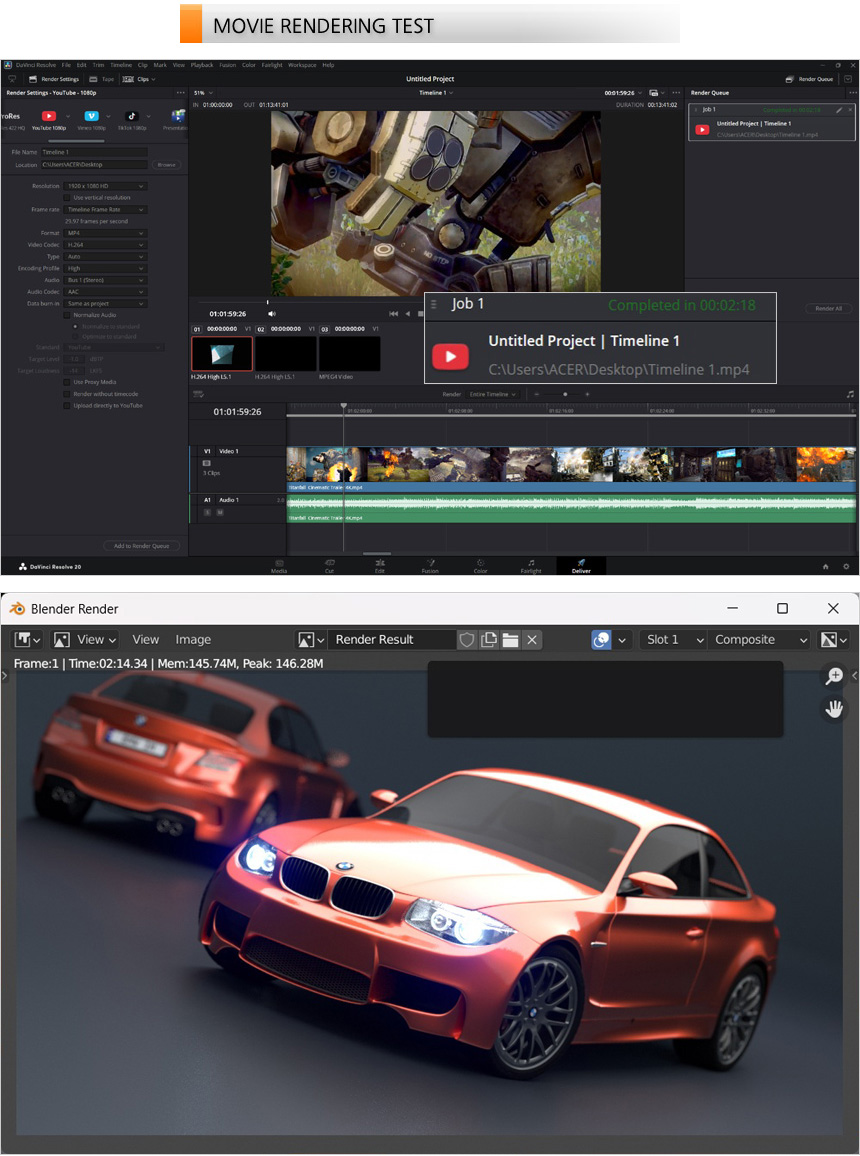 영상편집 S/W 다빈치 리졸브를 이용해 랜더링 테스트를 진행하고 있는 모습으로 (640MB, 920MB, 990MB 4K 동영상을 단일 동영상으로 랜더링, FHD 해상도에 H.264 비디오 코덱) 2분 18초가 소요되는 것을 확인할 수 있었다. 또한 블랜더 랜더링 테스트 에서는 2분 14초가 소요되었다. @ 영상편집과 같은 크리에이터 노트북으로도 유용하게 사용할 수 있을 것이다.