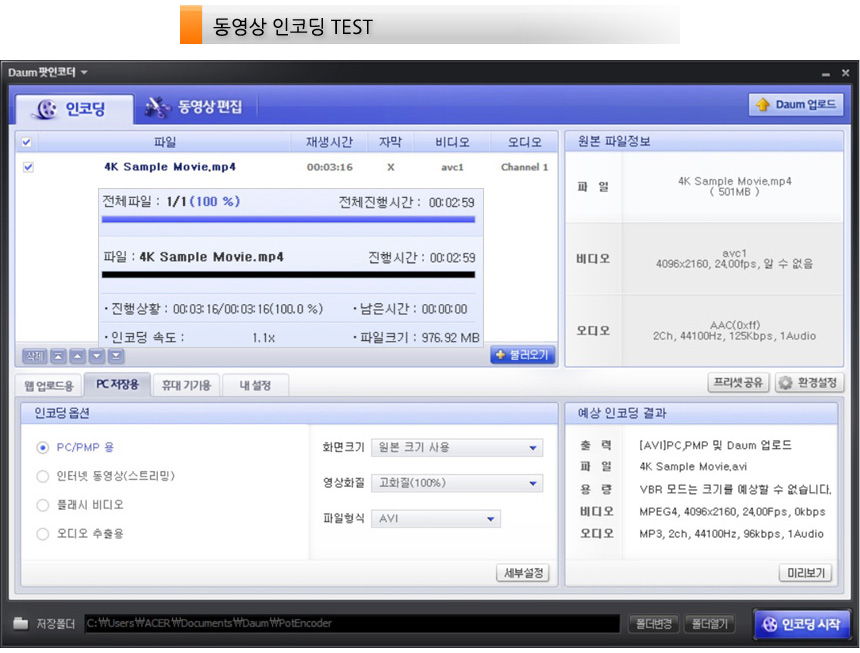다음 팟인코더를 이용해 4K 동영상의 인코딩 테스트를 진행하고 있는 모습으로 2분 59초의 짧은 인코딩 시간을 보여주었다. (3분 이상의 인코딩 시간을 보여주는 대부분의 노트북과 달리 3분 이내에 인코딩을 완료했다.)