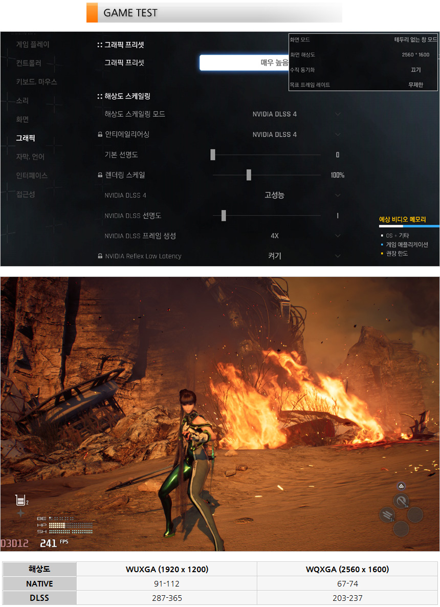 스텔라 블레이드를 플레이 하고 있는 모습으로 DLSS를 활성화 하면 WQXGA 해상도 에서도 200프레임 이상을 확보할 수 있어 부드럽게 게임을 플레이 할 수 있다. (DLSS 의 경우 프레임 생성을 4X로 설정했다.)