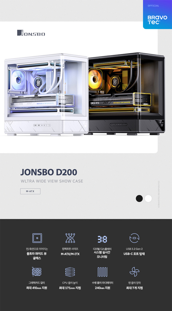 브라보텍에서 입체적인 라인과 곡면 글래스 가공을 통해 독창적인 디자인을 구현하고, 실시간 시스템 모니터링이 가능한 디지털 디스플레이를 탑재한 프리미엄 PC 케이스 JONSBO D200을 새롭게 선보인다.
