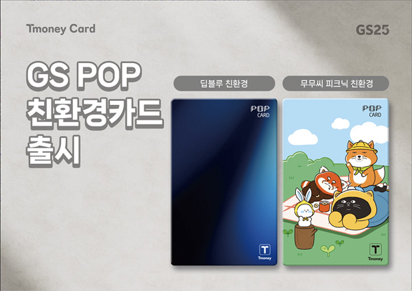 이번에 출시되는 친환경 티머니카드는 ▲GSPOP 티머니_딥블루 친환경, ▲GSPOP 티머니_무무씨 피크닉, 총 2종으로 구성되어 있다. 재활용 플라스틱 일부를 사용한 업사이클링 카드로 친환경 소재를 적용해 ESG 가치 실현이 가능하다는 게 특징이다.