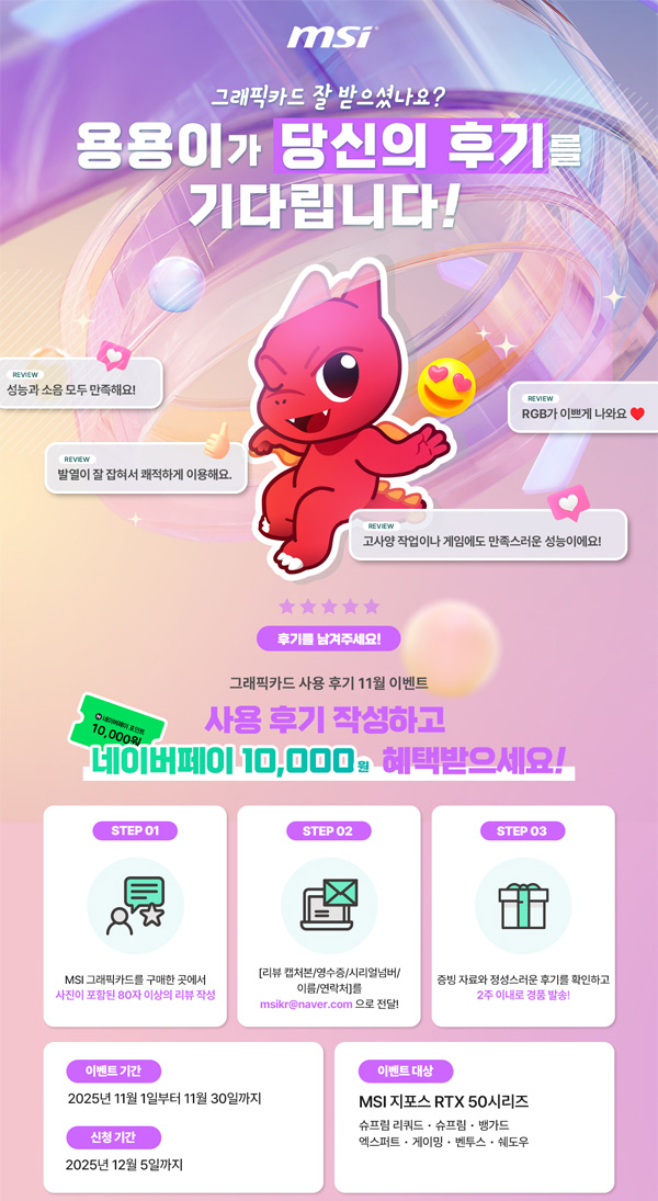 이번 이벤트는 그래픽카드를 구매하고 후기를 작성한 고객에게 네이버페이 포인트 10,000원권을 증정하는 형태로 진행된다. MSI 지포스 RTX 50 시리즈를 2025년 11월 1일부터 11월 30일까지 구매한 고객이라면 누구나 참여할 수 있으며, 이벤트 신청은 2025년 12월 5일까지 가능하다.