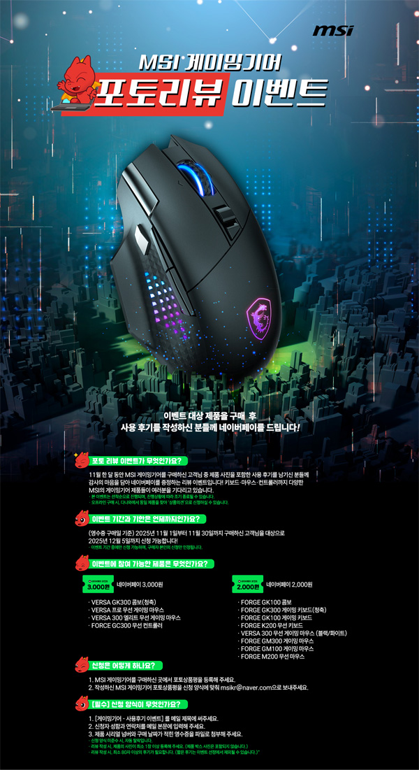 MSI는 MSI 인기 게이밍기어를 구매한 고객을 대상으로 11월 한 달간 사용 후기 이벤트를 진행한다고 밝혔다.