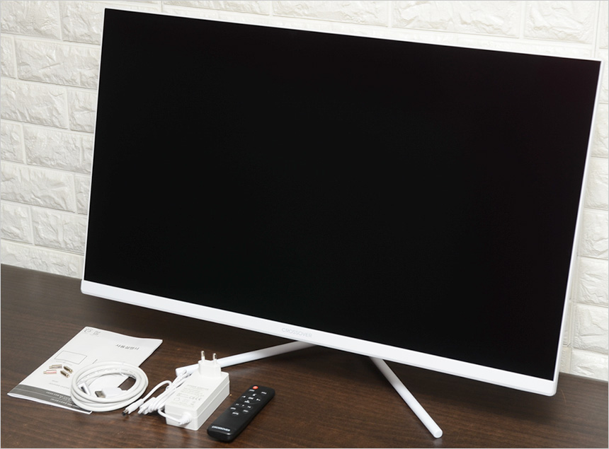 풀KIT 의 모습으로 모니터를 비롯해 케이블 일체형 전원 어댑터와 DP 케이블이 제공되며 사용 설명서와 베사 연장볼트, 리모콘이 포함되어 있다.