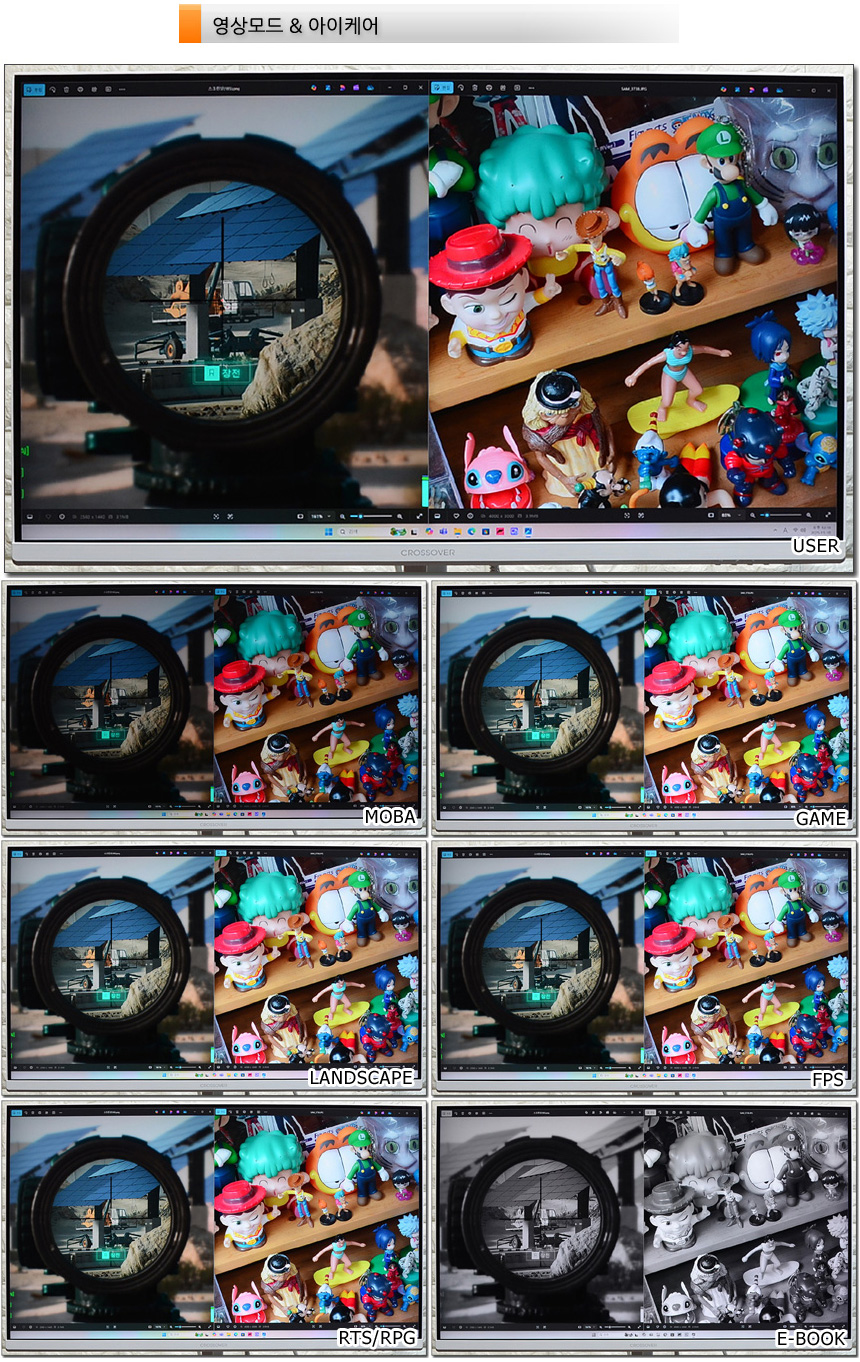 눈건강을 해치는 블루라이트 감소 기능을 제공한다. 상단의 사진은 단계별 영상의 모습으로 설정값에 따라 차이가 발생하는 것을 확인할 수 있다.