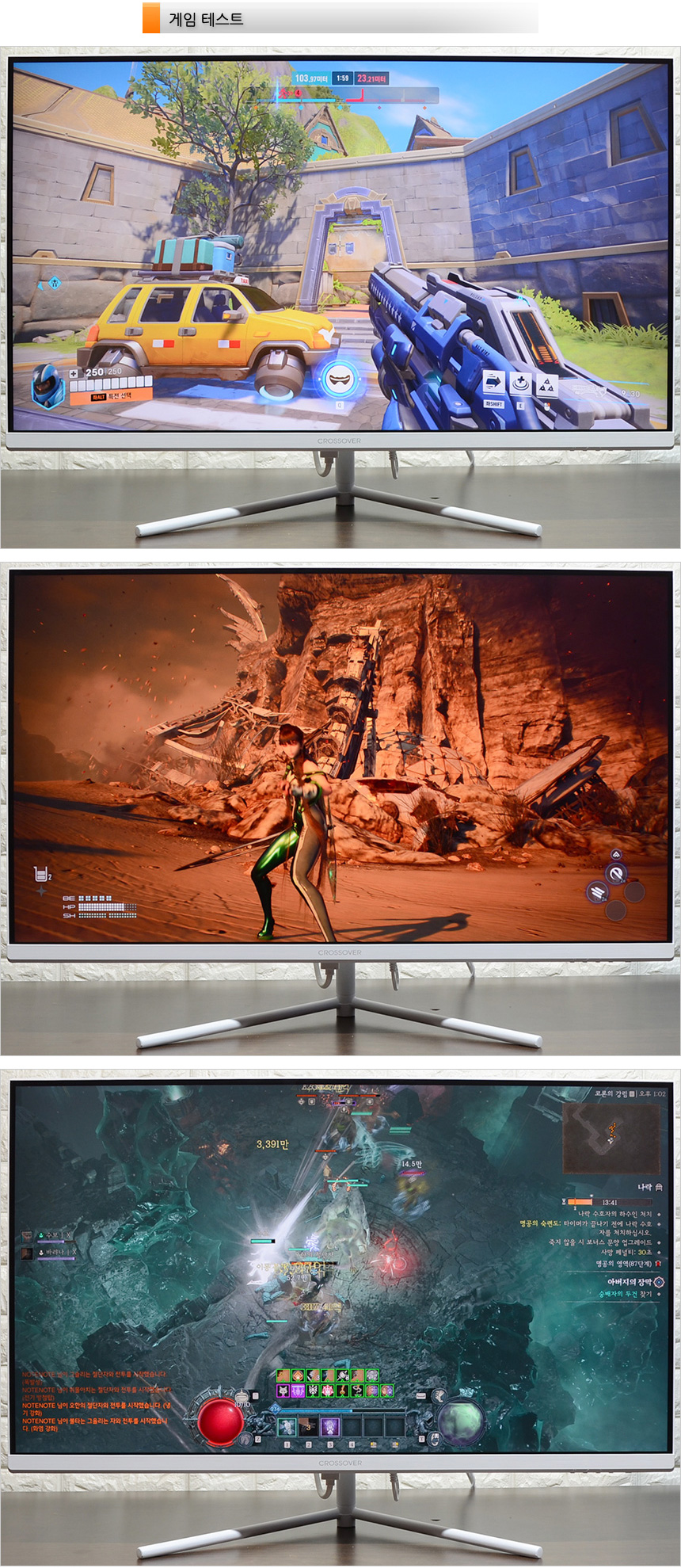 게임과는 거리가 있는 모델이지만 다양한 게임관련 기술이 적용되어 대부분의 게임을 편하게 즐길 수 있었다. 기본적으로 높은 밝기를 지원할 뿐만 아니라 블랙레벨이나 쉐도우 Ai 비전등의 기술이 적용되어 어두운 곳에서도 높은 시인성을 구현했으며 다양한 화면모드를 제공해 게임에 최적화된 영상을 빠르게 설정할 수 있었다. 또한 지싱크 호환기술이 적용되어 화면 찢어짐 등의 불편없이 게임에 몰입할 수 있었다.