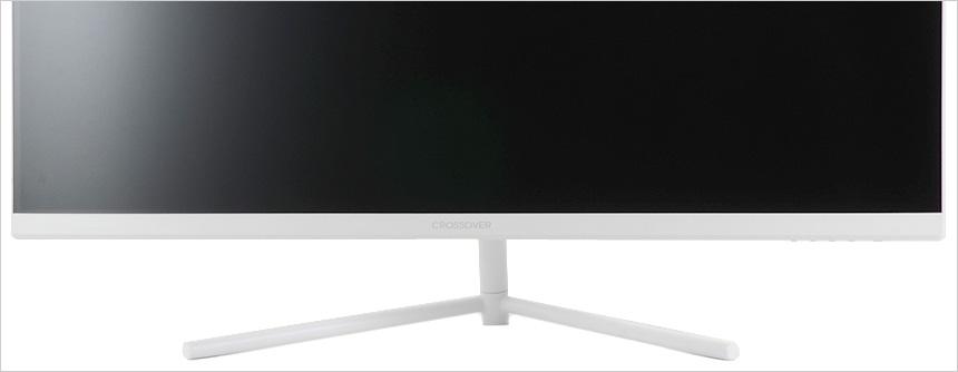 모니터 전면 하단부의 모습으로 중앙에 크로스오버 레터링이 세겨져 있으며 측면 하단에는 모니터 환경설정을 위한 OSD 버튼과 상태표시 LED, 2개의 3W 스피커가 장착된 것을 확인할 수 있다.