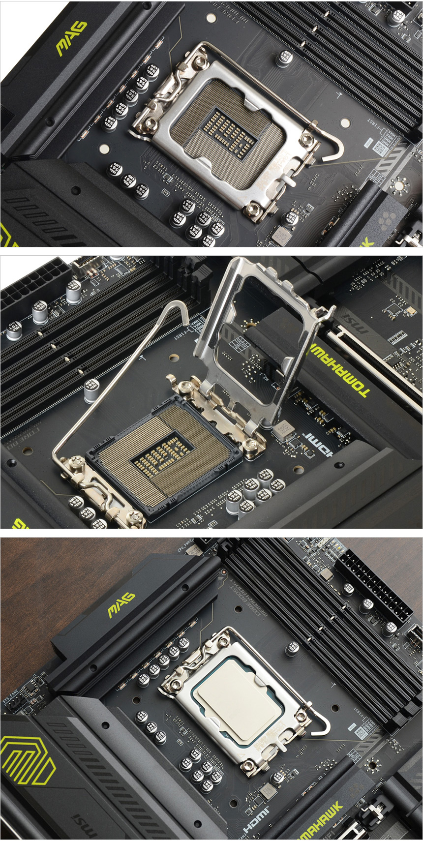 걸쇠를 눌러 풀어주고 가이드를 들어 올린 후 CPU를 내려놓고 가이드를 내리고 걸쇠를 채워주면 CPU를 장착할 수 있다. CPU에 홈이 한방향에만 설치되어 기존 프로세서 대비 편하게 위치를 확인할 수 있다.