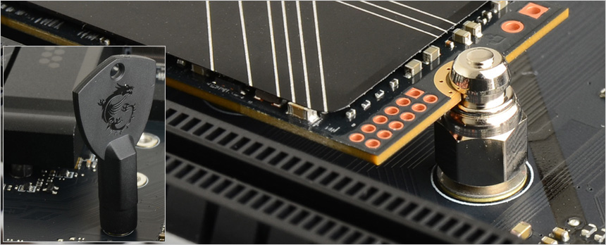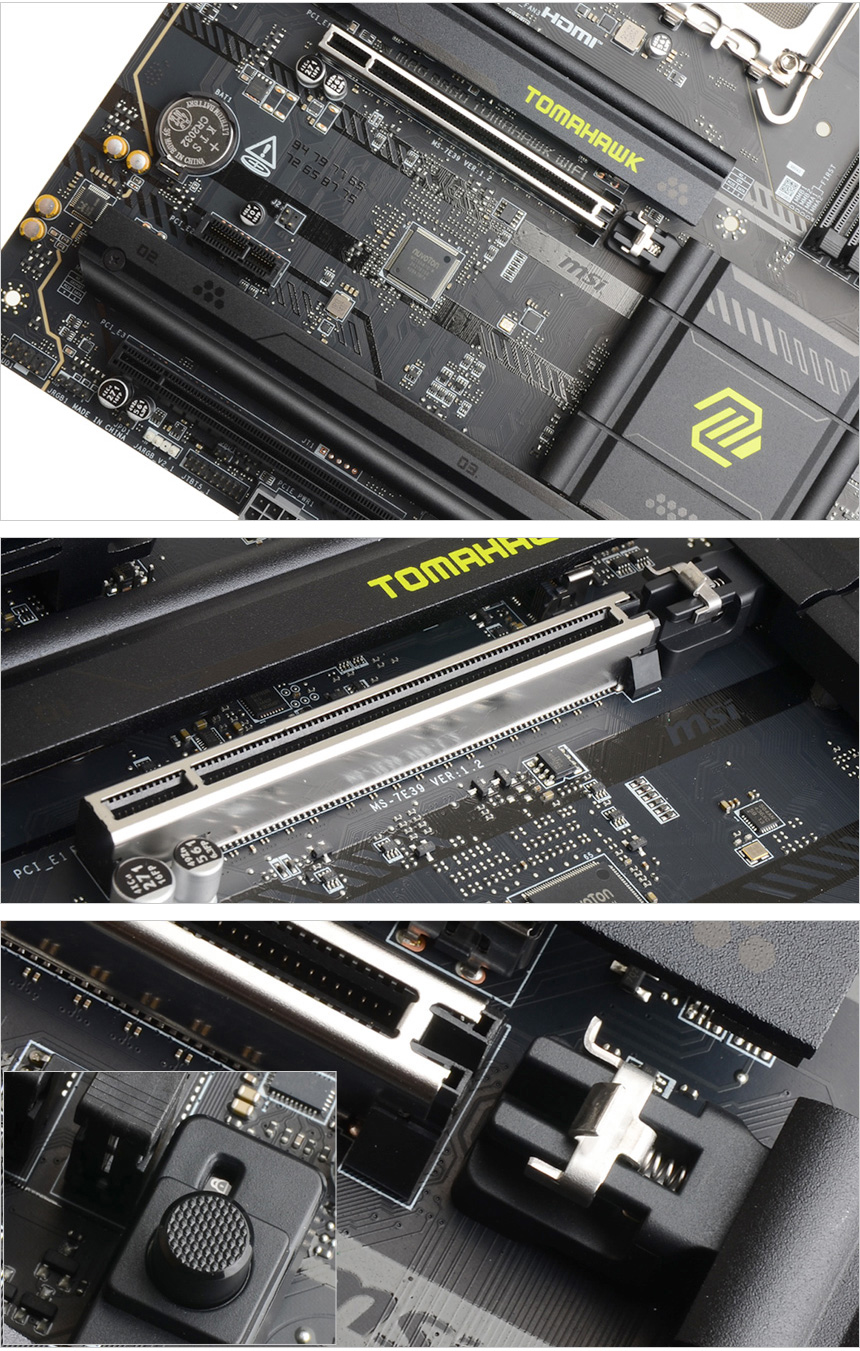 보급형 메인보드와 달리 더 편하게 그래픽카드를 분리하기 위해 EZ PCIe 릴리스 기술이 적용된 것도 눈에 띈다. 힘들게 클립을 누를 필요 없이 사진에 보이는 버튼을 누르는 것만으로 손쉽게 그래픽 카드를 고정시키거나 분리 상태를 만들 수 있다.