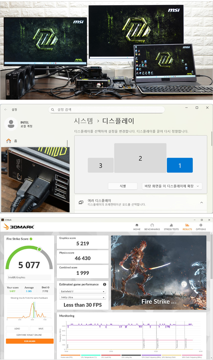 HDMI 2.1과 DP, 썬더볼트 4 단자를 지원해 내장그래픽에서도 멀티 디스플레이 환경을 만들 수 있다. 상단의 사진은 내장그래픽 상태에서 4K와 2개의 FHD 모니터를 연결한 모습으로 완벽하게 작동하는 것을 확인할 수 있었다. (고성능 시스템이 필요하지만 그래픽카드는 사용할 필요가 없는 주식용 등에서 유용하게 활용할 수 있다.)