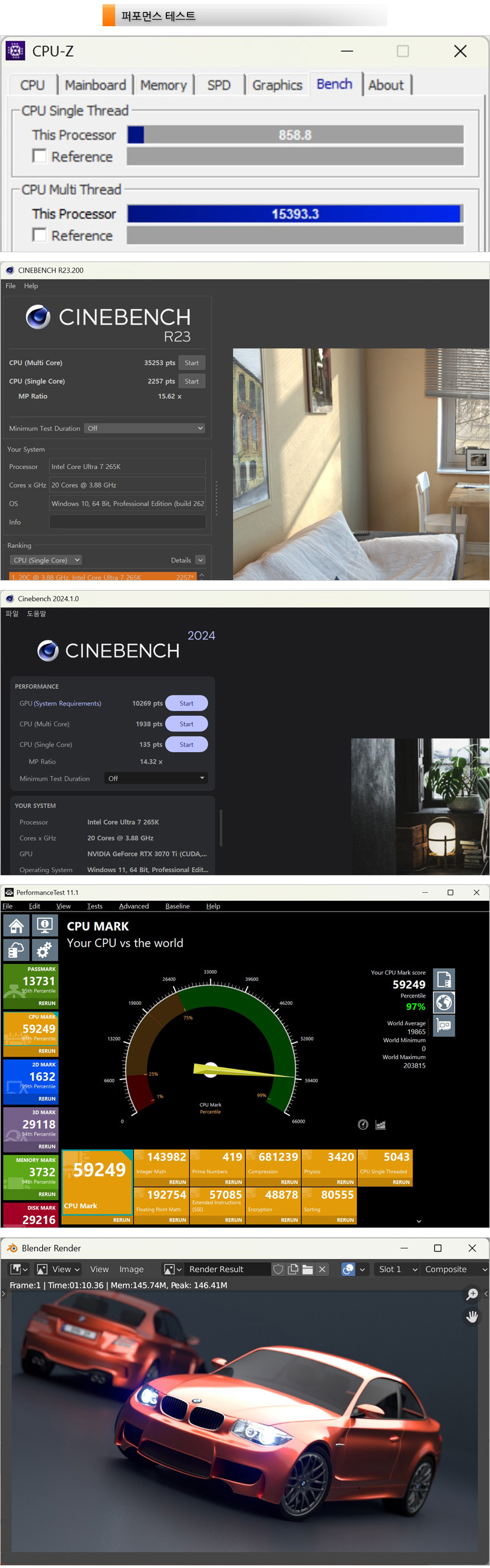 벤치마크 프로그램과 랜더링 프로그램을 이용해 성능 테스트를 진행하고 있는 모습으로 265K 의 성능을 제대로 뽑아주는 것을 확인할 수 있었다. 물론 Z시리즈 메인보드와 달리 오버클럭 설정은 지원하지 않아 더 높은 성능구현은 힘들지만 안정성을 우선으로 하는 작업용 PC를 구성할 경우 좋은 선택이 될 것이다.