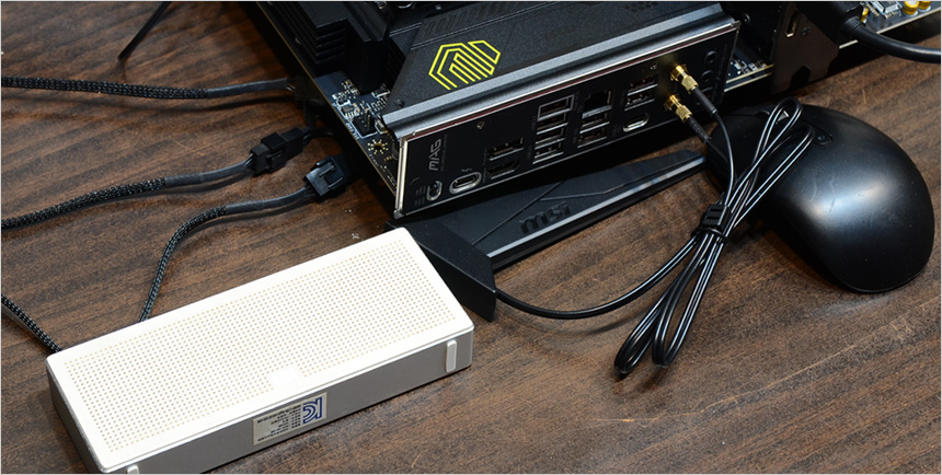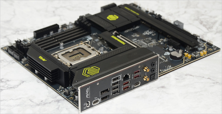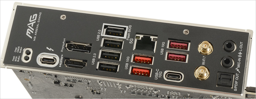 또한 S/PDIF를 포함한 오디오 단자가 설치되어 있고 5G 이더넷 단자와 Wi-Fi 7 무선랜 사용을 위한 2개의 안테나 단자가 설치되어 있는것도 눈에 띈다. (볼트를 돌려주어야 했던 예전과 달리 밀어주면 자동 장착되도록 설계해 편의성을 높였다.) 내장그래픽 사용자를 위해 HDMI 2.1 단자와 DP 단자를 제공하며 5개의 USB 3.2 Gen2 단자 (C타입 포함) 와 4개의 USB 2.0 단자 지원으로 여유롭게 주변기기를 연결할 수 있다.