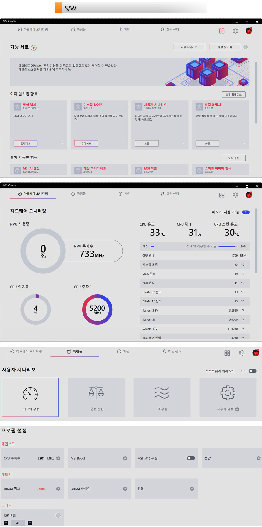 MSI는 전용 S/W MSI 센터를 제공해 PC를 편하게 관리할 수 있다. (MS 스토어에서 프로그램 설치가 가능하다.) 모듈형으로 구성되어 원하는 앱을 손쉽게 설치하고 실행할 수 있으며 다양한 사용모드를 제공해 PC 사용목적에 따라 프로그램을 셋팅할 수 있다. 또한 시스템의 작동 상황을 한눈에 확인할 수 있도록 모니터링을 지원하고 사용자 시나리오를 통해 퍼포먼스와 오버클럭 설정이 가능하다.