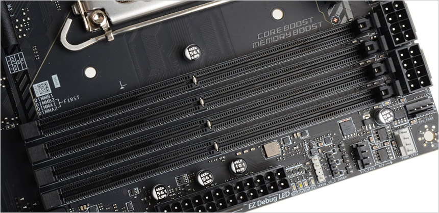 고급형 모델답게 4개의 메모리 슬롯이 제공되며 최대 9200+ MT/s 의 DDR5 OC 메모리 사용이 가능하다. XMP 셋팅을 제공해 기본 메모리 뿐만 아니라 고클럭을 지원하는 튜닝램을 장착해 성능을 높일 수 있으며 메모리 장착 우선순위가 메인보드에 프린팅 되어 듀얼채널 구성시 빠르게 메모리를 장착할 수 있다.