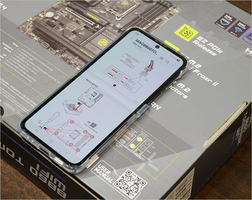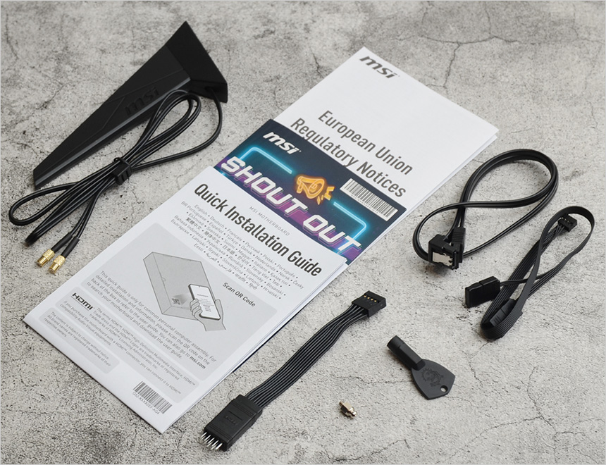 기본 제공되는 액세서리의 모습으로 퀵 매뉴얼과 Wi-Fi 안테나를 비롯해 SATA 케이블, EZ클립 II, 클립 리무버, EZ Conn 케이블 등이 제공되는 것을 확인할 수 있다. 또한 PC케이스 전면부 케이블을 쉽게 연결할 수 있도록 프런트 패널 커넥터도 지원한다. MSI 최신 메인보드는 탄소 절감과 환경보호를 실천하기 위해 설명서가 파일로 제공된다. 박스 후면에 있는 QR코드를 스마트폰으로 스캔하면 사용설명서를 다운로드 받을 수 있다.