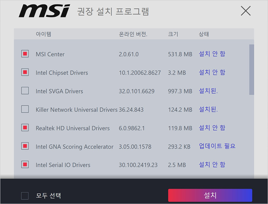 MSI 메인보드는 인터넷에 연결되어 있으면 MSI 드라이버 유틸리티 인스톨러가 실행되어 손쉽게 드라이버를 설치할 수 있다. 편하게 PC 셋팅을 완료할 수 있을 것이다.
