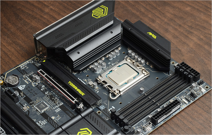 CPU 소켓의 모습으로 인텔코어 울트라 (시리즈2) 프로세서 지원 메인보드로 LGA 1851 소켓이 적용된 것을 확인할 수 있다. 사방에는 홀이 설치되어 인텔 기본쿨러를 비롯해 다양한 공랭 & 수랭 쿨러를 장착할 수 있다. 참고로 LGA 1700 과 외관은 동일해 기존에 사용하던 쿨러를 그대로 활용할 수 있지만 내부 핀 배열이 다르기 때문에 CPU는 호환되지 않는다.