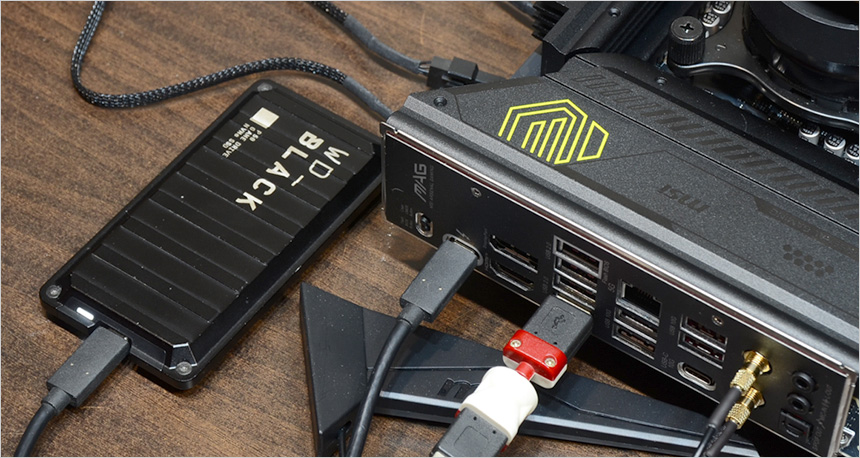썬더볼트 4 단자를 지원해 초고속 데이터 전송이 가능하다. 상단의 사진은 USB 3.2 Gen2x2 지원 외장 SSD를 장착해 속도 테스트를 진행하고 있는 모습으로 2,000MB/s 가 넘어가는 빠른 속도를 보여주었다. 대용량의 데이터를 다루는 유저들이라면 유용하게 활용할 수 있을 것이다. (USB 3.2 Gen2x2 지원제품을 사용해야 최대 속도를 즐길 수 있다. 외장 SSD 구입시 스펙을 확인하기 바란다.)