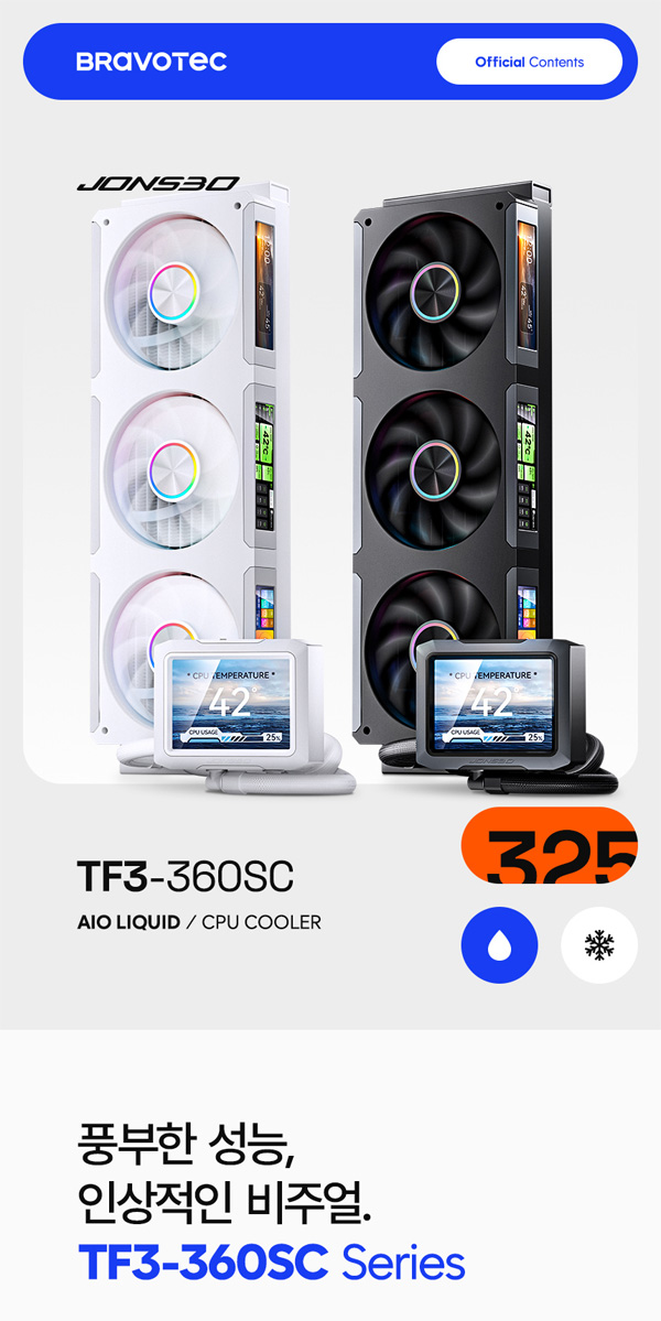 브라보텍에서 프리미엄 비주얼과 강력한 쿨링 성능을 갖춘 일체형 수랭쿨러 TF3-360SC와 팬 쿨러 ZC-360을 출시한다. 펌프 및 팬 쿨러에 광시야각 IPS 디스플레이를 탑재하여 탁월한 튜닝 효과와 뛰어난 쿨링 성능을 갖춘 것이 특징이다.