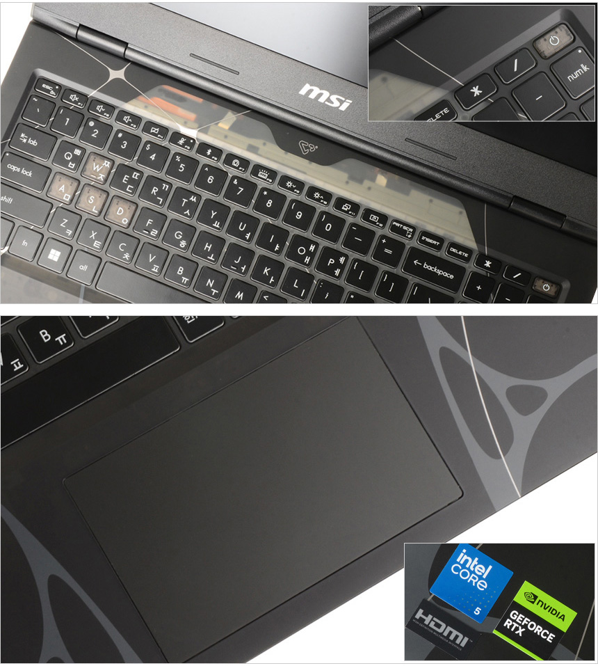 키보드 상단에는 다양한 단축키를 제공해 편하게 노트북을 사용할 수 있으며 측면에는 반투명 재질로 시인성을 높인 전원 버튼이 설치된 것을 확인할 수 있다. 또한 팜래스트 중앙에는 대형 멀티 터치패드가 장착되어 마우스를 사용하기 힘든 외부에서도 편하게 노트북을 조작할 수 있다.