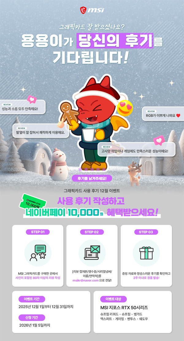 이번 이벤트는 그래픽카드를 구매하고 후기를 작성한 고객에게 네이버페이 포인트 10,000원권을 증정하는 형태로 진행된다. MSI 지포스 RTX 50 시리즈를 2025년 12월 1일부터 12월 31일까지 구매한 고객이라면 누구나 참여할 수 있으며, 이벤트 신청은 2026년 1월 5일까지 가능하다.