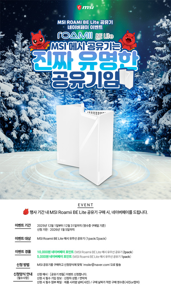 MSI는 메시 유무선 공유기 MSI Roamii BE Lite 제품을 구매한 고객을 대상으로 간단한 구매 인증만으로 네이버페이 포인트를 증정하는 프로모션을 진행한다고 밝혔다.