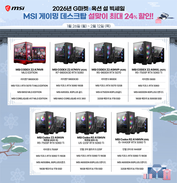 MSI는 1월 26(월)부터 2월 12일(목)까지 진행되는 G마켓&옥션 ‘설 빅세일’을 통해, 강력한 성능의 게이밍 데스크탑 ‘Codex(코덱스)’ 시리즈를 상반기 최대 혜택가로 판매한다.