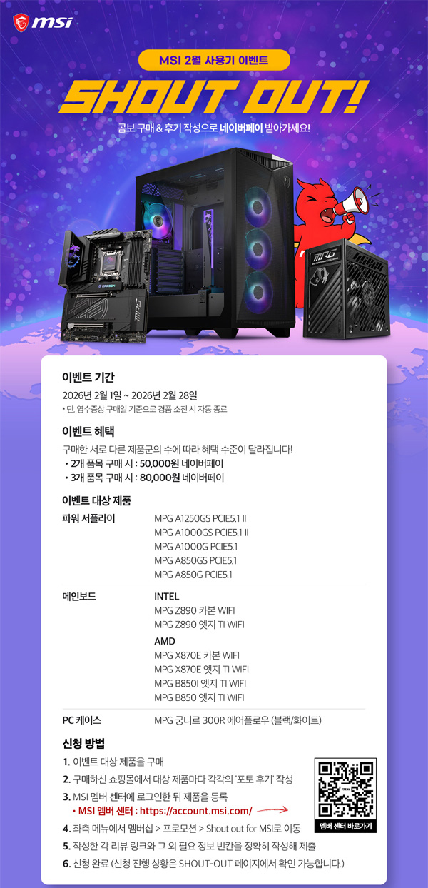 두 번째는 ‘콤보 구매후기 이벤트’를 통한 체감가 하락이다. MSI MPG 시리즈 메인보드(Z890, X870E, B850 등)와 함께 MPG 시리즈 파워 또는 케이스를 세트로 구매하고 후기를 남기는 고객에게는 네이버페이 포인트를 추가로 증정한다. 즉시 할인에 후기 이벤트 혜택까지 더해져 실제 구매 체감가는 더욱 낮아진다.