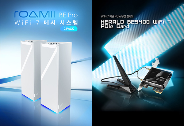 MSI는 차세대 무선 규격 WiFi 7을 지원하는 메시 유무선 공유기 ‘MSI Roamii BE Pro’와 데스크톱용 무선 확장 카드 ‘HERALD BE9400 WiFi 7 PCIe Card’를 출시한다고 밝혔다.