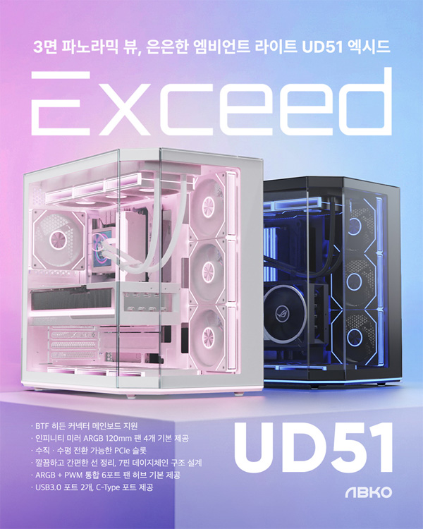 앱코에서 전면과 측면, 그리고 사선 패널에 강화유리를 적용한 3면 파노라믹 뷰 어항형 케이스, ‘UD51 엑시드 ARGB BTF (이하 UD51 엑시드)’를 새롭게 선보였다. 사선 패널이 추가된 구조를 통해 일반적인 직각형 어항 케이스와는 차별화된 입체감을 구현하여 하드웨어의 LED 조명을 더욱 극적으로 드러내며, 탁 트인 개방감과 세련된 비율은 게이밍은 물론 데스크테리어를 중시하는 사용자에게도 높은 만족감을 제공한다.