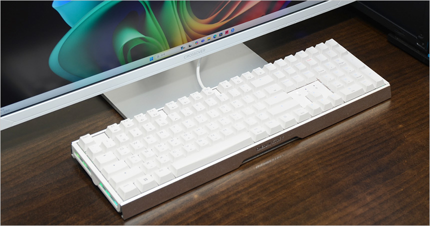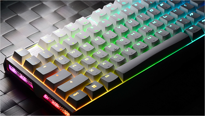 기기의 디자인은 심플하지만 높은 마감완성도로 상당히 고급스러운 것을 확인할 수 있었다. 밝고 화사한 화이트 컬러를 적용했으며 (참고로 블랙 컬러도 출시되어 사용자의 취향에 따라 선택할 수 있다. 아노다이징 처리된 알루미늄 하우징을 적용해 세련된 느낌을 자아내는 것은 물론 내구성도 한층 높였다. 또한 PC를 켜면 키스위치와 측면에 화려한 RGB LED가 작동해 게이밍 키보드 다운 화려한 모습을 변신한다.
