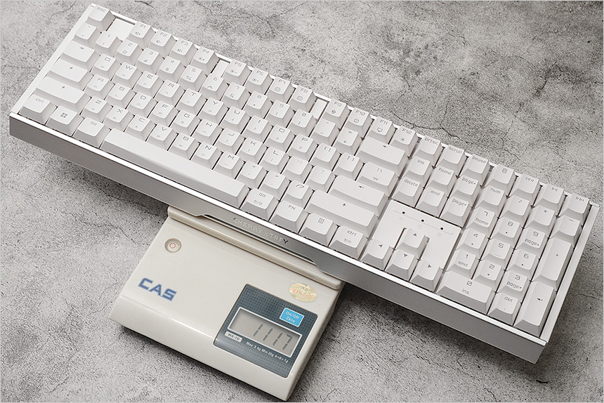 무게 테스트를 진행한 모습으로 1117g 을 보여주었다. (케이블 제외) 무보강 구조로 무게를 줄인 기존 모델들과 달리 보강판과 소음차단을 위한 실리콘 패드, PCB, EVA폼의 보강구조를 적용해 단단하고 안정감 있는 타건감을 선사하며 타이핑시 발생할 수 있는 잡소리를 효과적으로 차단해 깔끔하게 타이핑 할 수 있다.