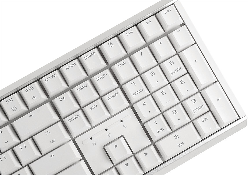 텐키를 지원하는 풀사이즈 키보드로 중앙에는 NUM, CAP, SCR 상태확인을 위한 LED가 제공되며 재생과 계산기 사용을 위한 핫키가 포함된 것이 눈에 띈다. 이 제품은 F열과 넘버키가 모두 있는 108키 풀배열 레이아웃을 지원해 숫자를 자주 누르는 사무환경은 물론 F키 활용하고 매크로 키 등록과 같은 다양한 키조합을 활용하는 게이밍 환경에서 모두 편하게 사용할 수 있다.