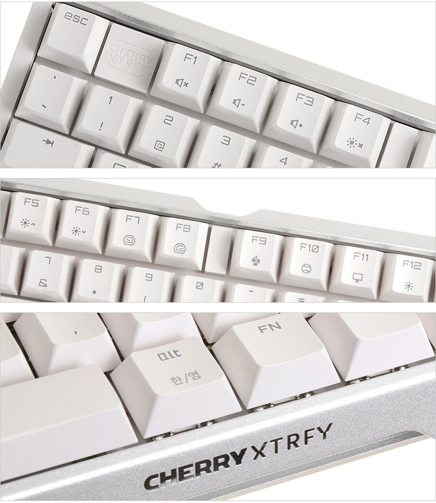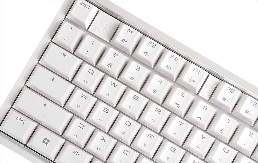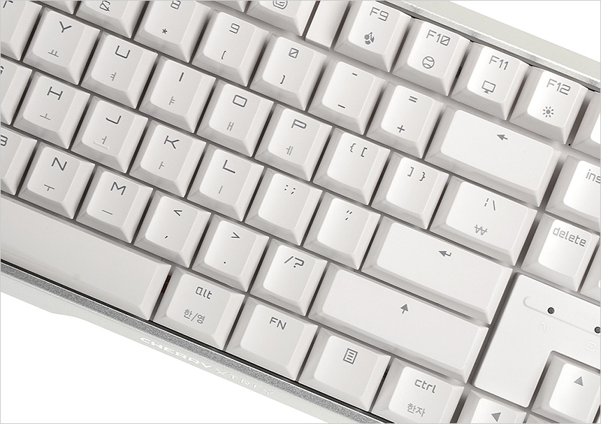 양 측면에 설치된 평션키의 모습으로 쉬프트 사용이 많은 국내 환경을 고려해 롱타입이 적용된 것을 확인할 수 있다. 또한 ESC와 F1 사이에 체리키를 지원했던 전작과 달리 체리키가 F9 로 이동한 것을 확인할 수 있다. S/W 실행을 편하게 할 수 있는 기능키지만 독립적인 ESC의 구분감이 떨어져 불편을 느끼는 유저들이 있었는데 이런 사용자의 의견을 반영해 체리키의 위치를 변경한 것이다.