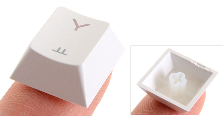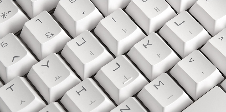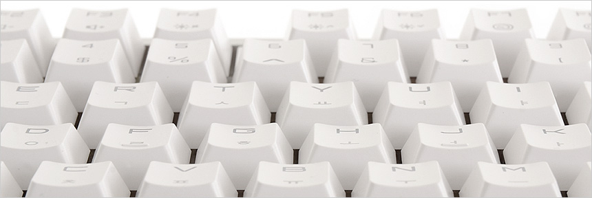 내구성과 내마모성을 높인 고품질 ABS 키캡의 모습으로 손가락이 자연스럽게 접촉할 수 있도록 라운드 형태로 구성된 것을 확인할 수 있도록 LED 백라이트의 시인성을 높일 수 있도록 이중사출이 적용된 것을 확인할 수 있다. (참고로 한글은 레이저 각인이다.) @ 장기간 사용 하더라도 폰트의 지워짐이 발생하지 않는다.