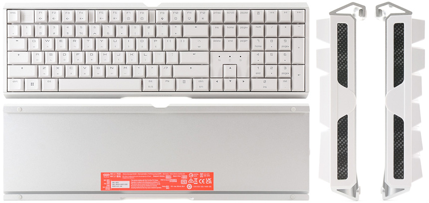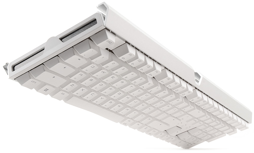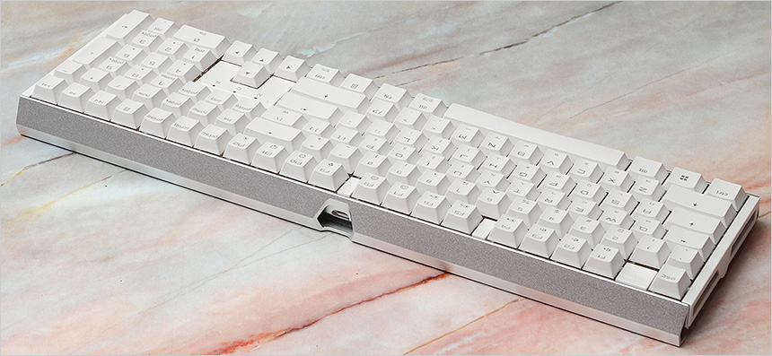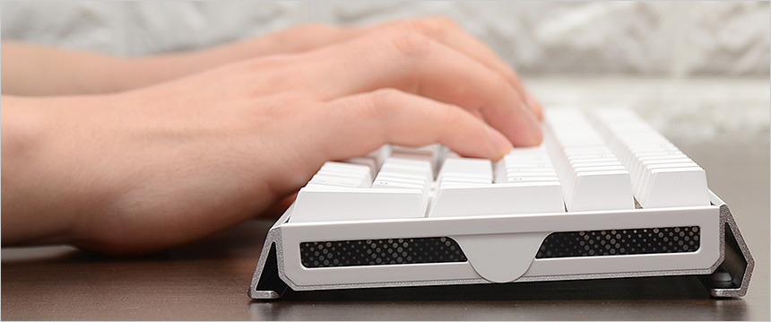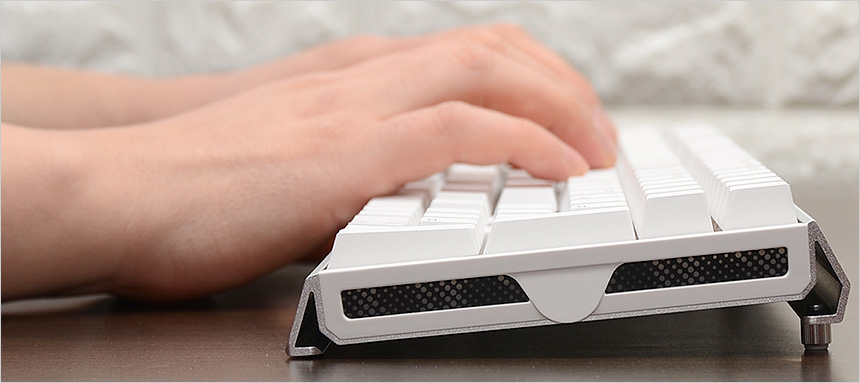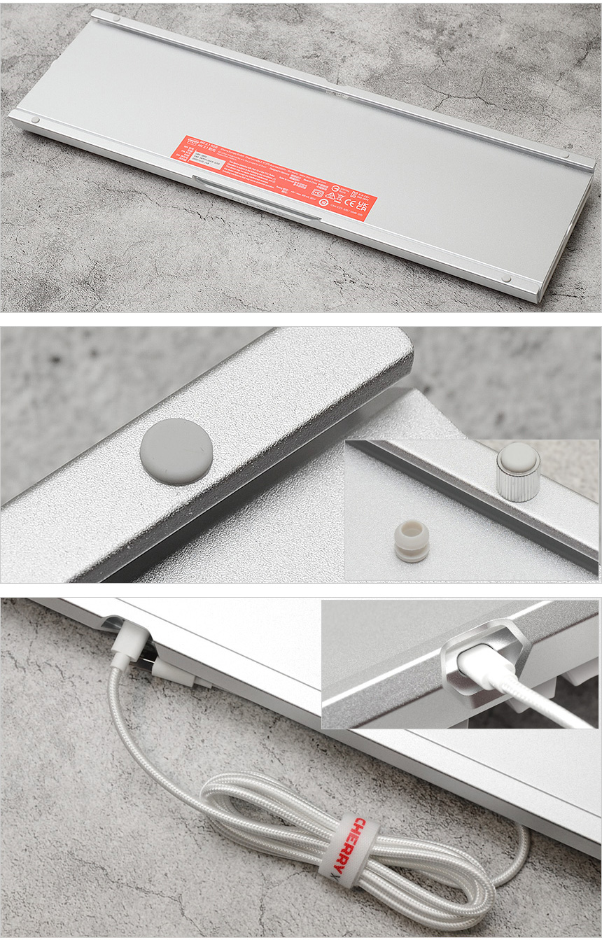 키보드 바닥면의 모습으로 일반 키보드와 달리 알루미늄 하우징이 적용된 것이 눈에 띈다. 모듈형 방식을 적용해 USB 케이블을 손쉽게 탈부착 할 수 있으며 사방에 고무패드가 부착되어 미끄러짐을 방지한다. 또한 높이조절 나사를 지원해 사용자에 맞게 키보드 각도를 조절할 수 있다. (고무패드를 빼고 높이조절 나사를 돌려끼우면 된다.)