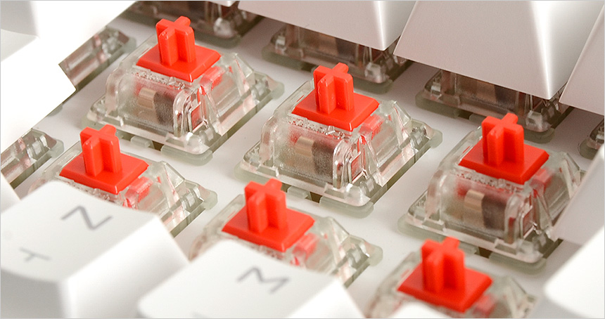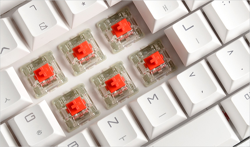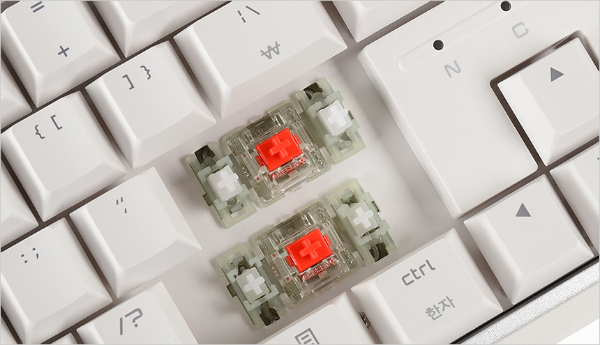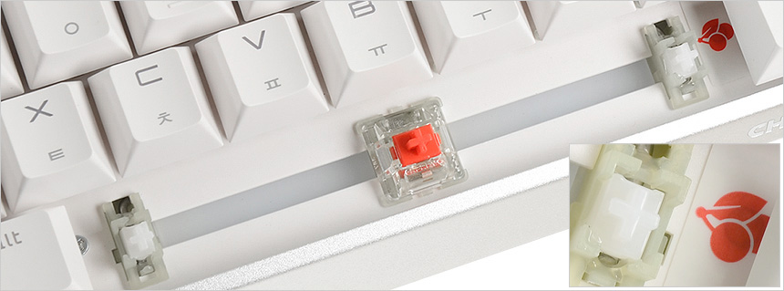 스페이스바나 쉬프트와 같은 긴 키에는 체리식 스테빌라이저를 적용해 스페이스바 어떤 부분을 눌러도 정확하게 인식되며 분리가 손쉬운 장점을 가지고 있다. (키캡을 쉽게 교체할 수 있으며 청소도 간편하다.)